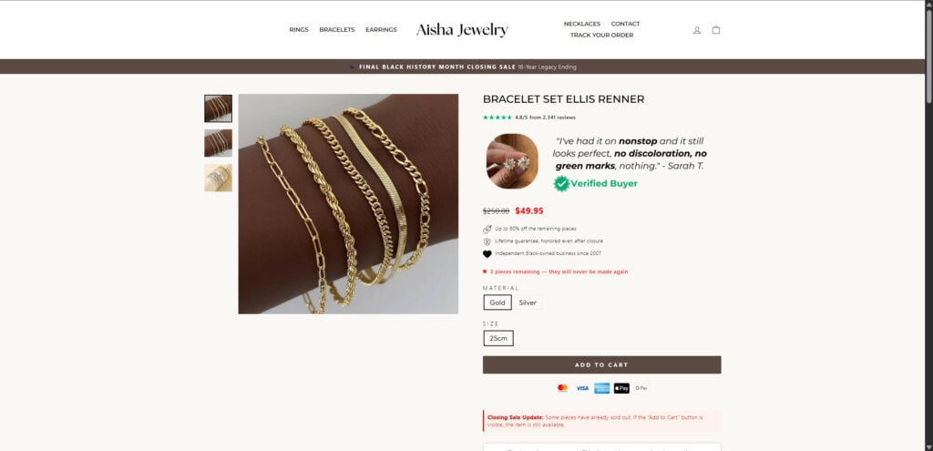 The Aisha Jewelry Closing Sale Scam fits a common online shopping pattern that has become increasingly popular across social media ads and temporary storefronts.