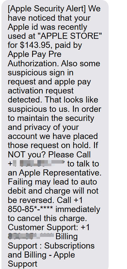 They typically claim there was a suspicious Apple Pay charge or unauthorized Apple ID activity, then urge you to call a phone number for immediate help. If you call, you are connected to scammers posing as Apple support who may try to gain remote access to your device, steal account or banking information, or pressure you into sending money.