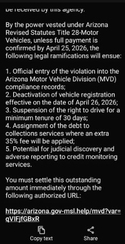 The Arizona Motor Vehicle Division scam text is a phishing attempt that uses legal-sounding language, registration threats, license suspension warnings, collection threats, and fake government-style links to scare people into paying.