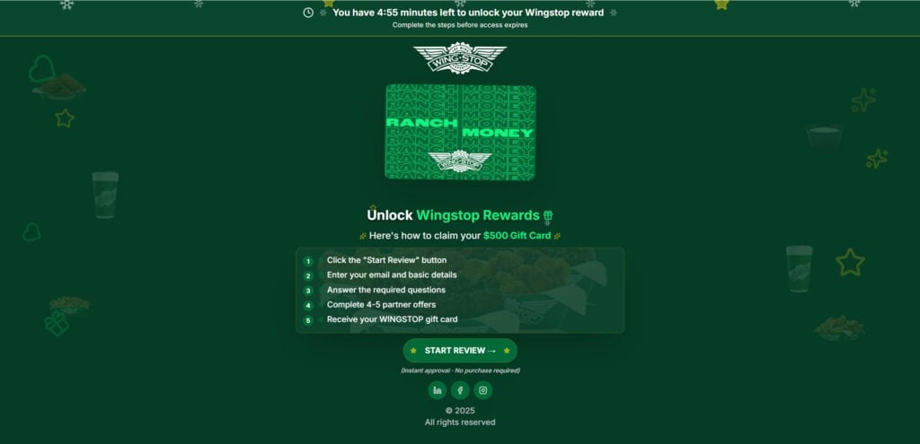 A person might be skeptical of an unknown website promising a random luxury prize. But a Wingstop gift card tied to a “review” or “reward” flow can feel plausible, especially if the page looks polished.