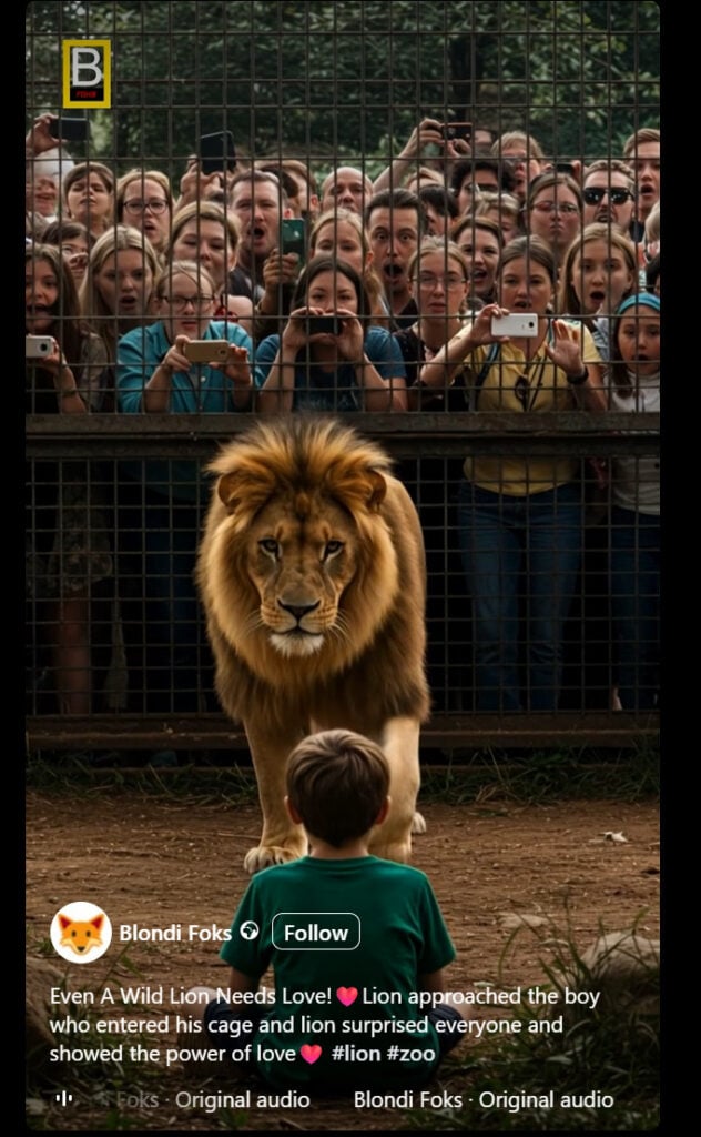 The “Even A Wild Lion Needs Love” video is just one of many AI-generated wildlife clips circulating online. Others show bears hugging people, tigers cuddling with children, or wolves protecting lost hikers. All share the same pattern: highly emotional, seemingly miraculous, and ultimately fake.