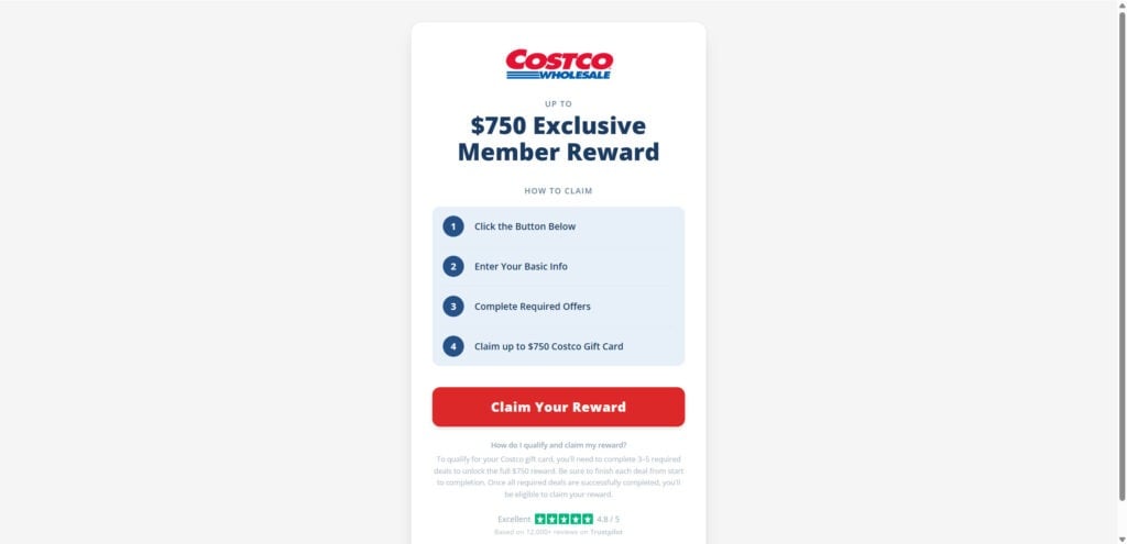 Most are not. If a site promises a Costco gift card worth up to $750 and requires you to complete “required offers” or “sponsor deals,” it is usually a reward funnel, not an official Costco promotion.