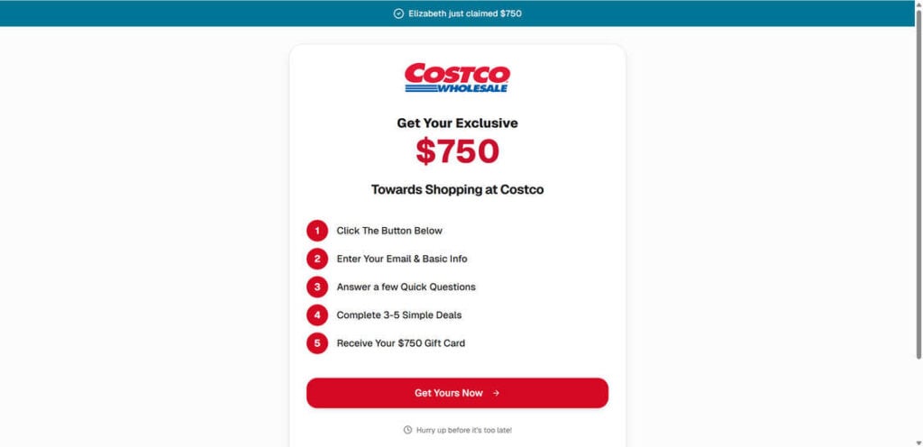 CostGifter is not a harmless rewards page. It appears to be a deceptive funnel that borrows Costco-style branding to make a fake reward offer look real. The promised $750 payout is the hook. The real business seems to be collecting user data, pushing people into third-party offers, and earning commissions while victims get nothing.