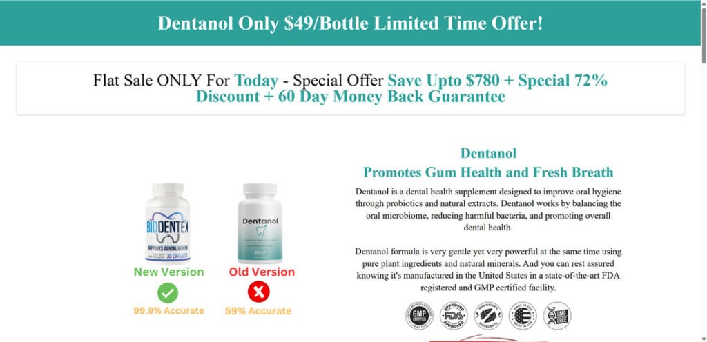 Dentanol is typically positioned as a “natural” solution with unusually broad benefits. The pitch often promises fast, noticeable results with little effort and minimal risk. On the surface, the branding is clean and confident, and the copy leans heavily on reassuring phrases that sound official.