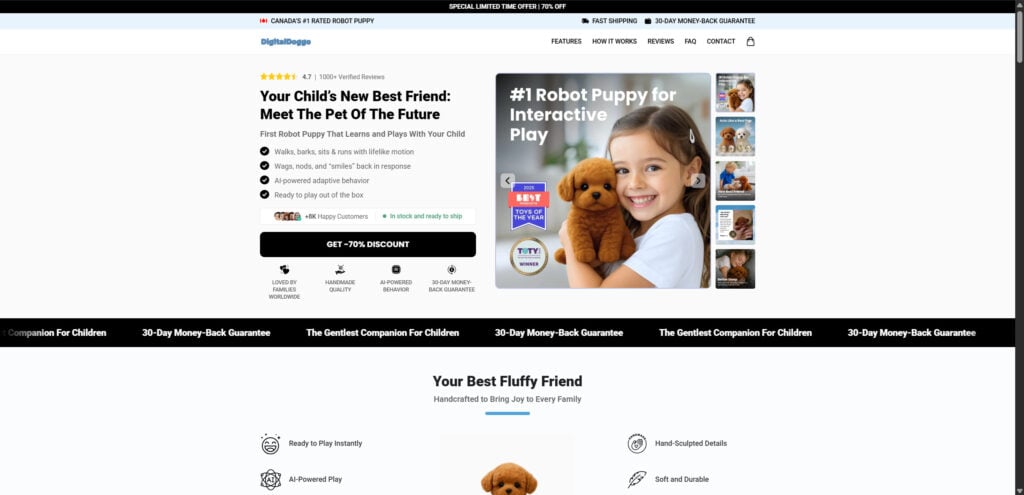 The homepage also includes a comparison chart that positions Digital Doggo against vague “other toys.” It claims competitor products lack realism and interactivity, while Digital Doggo supposedly delivers realistic behavior, touch-responsive reactions, premium materials, and a true companionship experience. The issue is that these claims are marketing assertions, and they often do not match the expectations created by the ads or the experience many buyers anticipate once the product arrives.