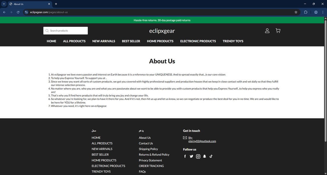 Authentic brands maintain social media pages for customer engagement. Eclipxgear.com’s total lack of accounts is highly unusual and suspicious.