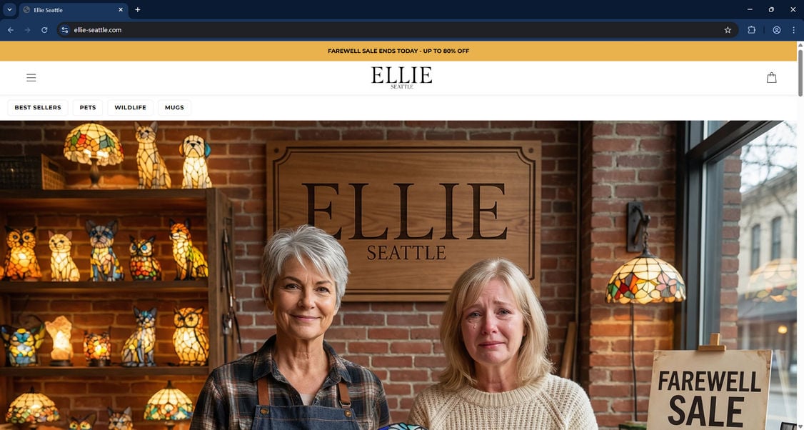Ellie-seattle.com shows the standard footprint of a scam storefront: aggressive social ads, unrealistic discounts, a polished template built to convert, and limited accountability through support that is often only an email address and a contact form.