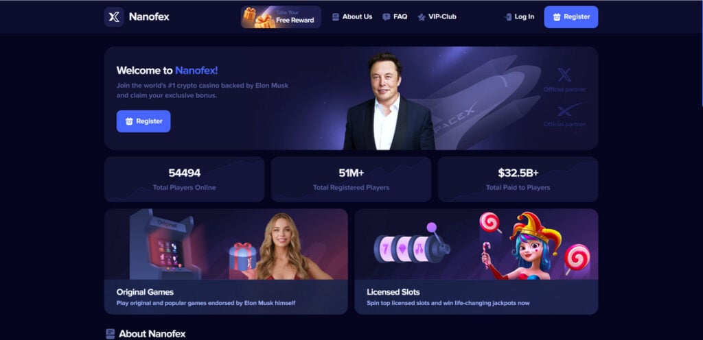These sites claiming to be a “#1 crypto casino backed by Elon Musk.” It also shows large numbers like “51M+ total registered players” and “$32.5B+ total paid to players.” These kinds of claims are typical trust-building tricks used by scam websites.