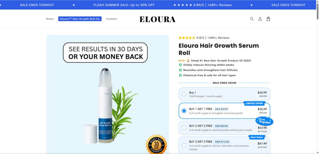 Curious about the Eloura Hair Growth Serum Roll and whether it lives up to its bold promises? You’re not alone. With flashy offers like “See results in 30 days or your money back,” “Buy 1 get 1 free,” and rapid regrowth claims, this roll‑on serum promises to solve your hair‑thinning woes fast. But are these claims backed by science, or is this just another slick sales pitch? We’re going beyond the hype to examine clinical evidence, marketing tactics, user feedback, and critical red flags, so you can decide for yourself.