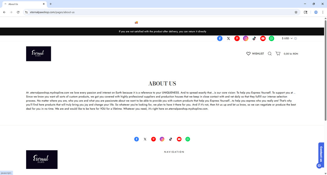 Authentic brands maintain social media pages for customer engagement. Eternalpawshop.com’s total lack of accounts is highly unusual and suspicious.