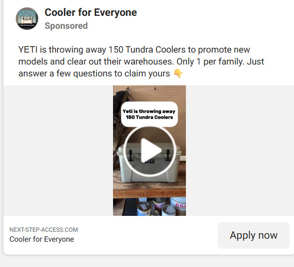 A flashy video. A familiar YETI logo. A confident voice claiming you have been “selected” for a free Yeti cooler, tumbler, or bag.