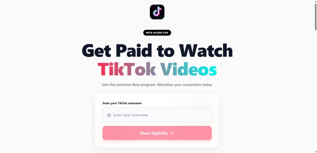 A slick page. A TikTok logo. A bold promise that feels almost believable: “Get paid to watch TikTok videos.”
