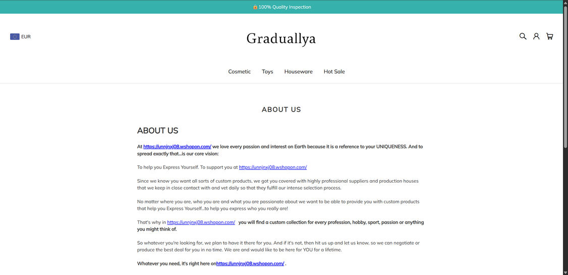 Graduallya.com displays many suspicious signs that it is a fraudulent website masquerading as a legitimate online retailer. Savvy shoppers should watch for these red flags:
