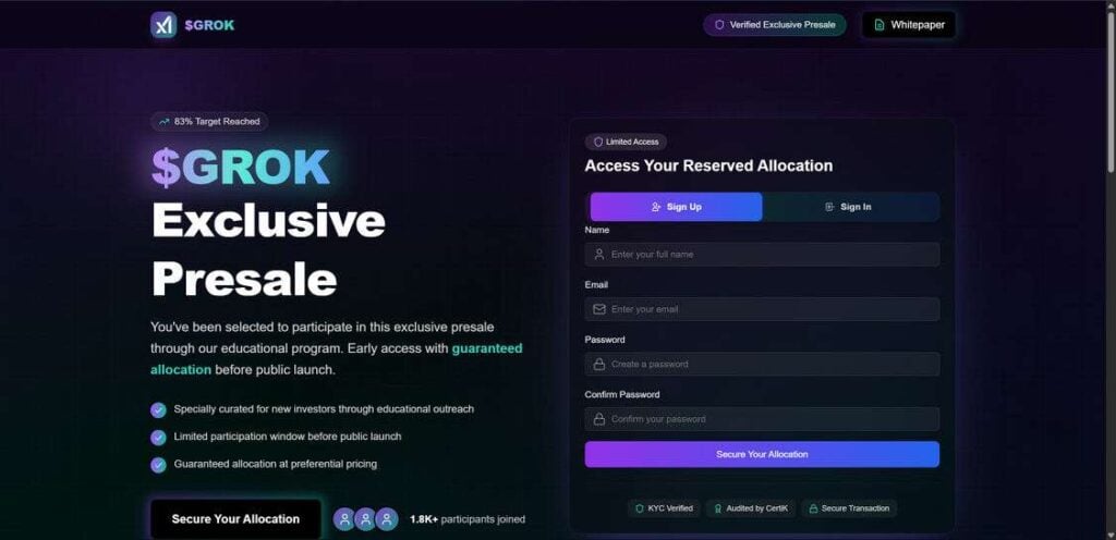 The fake websites promote an “exclusive presale” where users can “secure their allocation” of a new Grok token, promising early investor bonuses and high returns. The scam page shown above mimics legitimate token sale platforms by using slick UI design, countdown timers, fake KYC badges, and bogus audits to convince people to sign up.