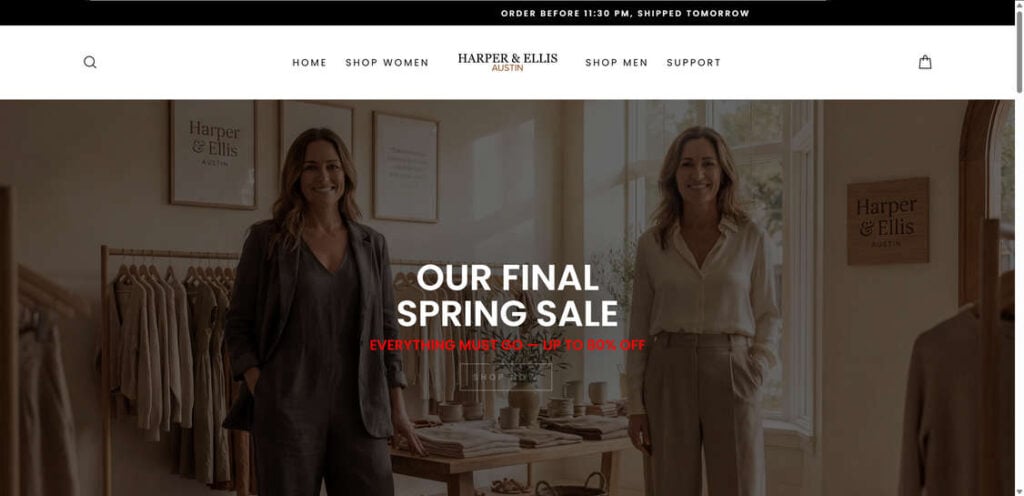 Harper & Ellis Austin fits a common high-risk “sale event” pattern: extreme discounts, urgency banners, a polished template, and claims meant to build trust fast. That does not prove fraud in every case, but it is enough to treat the store as high risk until you can verify it outside the site itself.