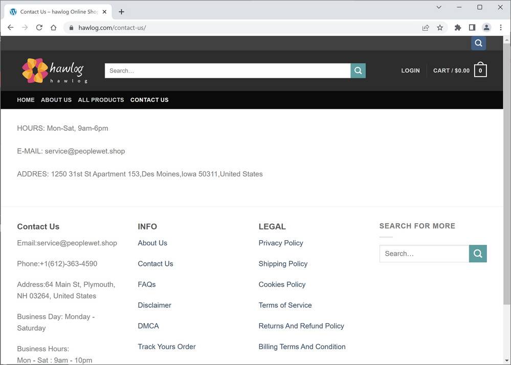 – The website has a fake contact address and email. The address listed on the website is 1250 31st St Apartment 153,Des Moines,Iowa 50311,United States. However, this address is associated with various scam online stores and does not belong to hawlog.com. The email address service@peoplewet.shop is also suspicious and does not match the domain name of the website.