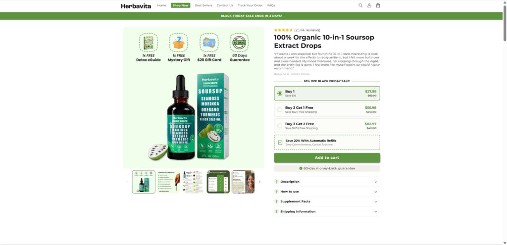 Herbavita Liquid Drops are promoted as a powerful blend of soursop, sea moss, moringa, oregano, turmeric, black seed oil, and several other ingredients packaged into a 10 in 1 formula. The website claims that the drops are backed by scientific studies, recommended by health professionals, and used by thousands of satisfied customers. These statements are crafted to encourage trust, reduce hesitation, and convince the shopper that the product is medically credible.