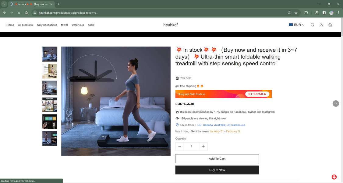 Scammers behind Heuhkdf.com use spam emails and social media platforms like Facebook, Instagram, and TikTok to promote the site and lure in victims. This fraudulent site uses incredibly low prices and stolen product images to entice unsuspecting shoppers.