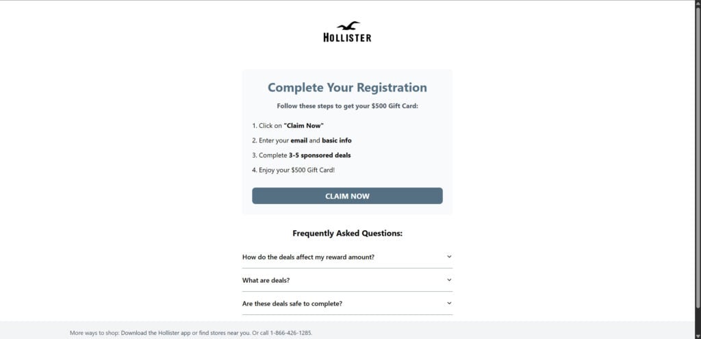 The Hollister Free $500 Gift Card promotion is a scam, plain and simple. It’s designed to exploit trust in a popular brand, collect your data, and make money through affiliate offers. There is no free gift card.