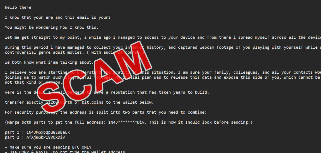 A strange and unsettling email lands in your inbox. It begins with the words, “I know that your are and this email is yours.” The message goes on to claim that the sender has hacked your computer, recorded intimate webcam footage of you, and threatens to release it to your family, friends, or coworkers unless you pay $1,200 in Bitcoin within 48 hours. The email even gives instructions on how to buy cryptocurrency and split the payment address in half to make it “secure.”