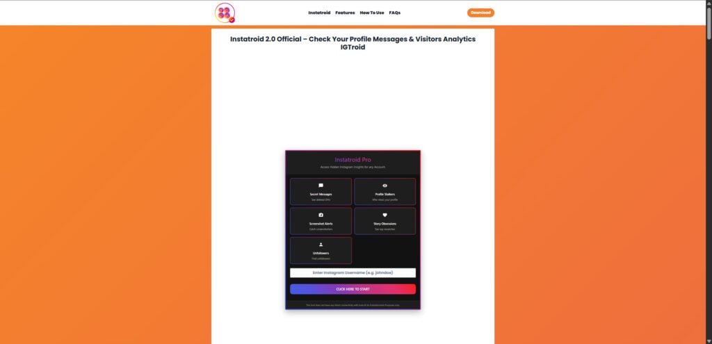 Instatroid Pro is not a legitimate Instagram tool. It is part of a broader ecosystem of fake “Instagram viewer,” “DM reader,” and “profile stalker” websites that recycle the same strategy under different names and domains. You might see it called “Instatroid Pro,” “Instatroid 2.0 Official,” “IGTroid,” or some other variation that sounds like a real software release. The version numbers, polished UI, and feature tiles are there to create trust fast.