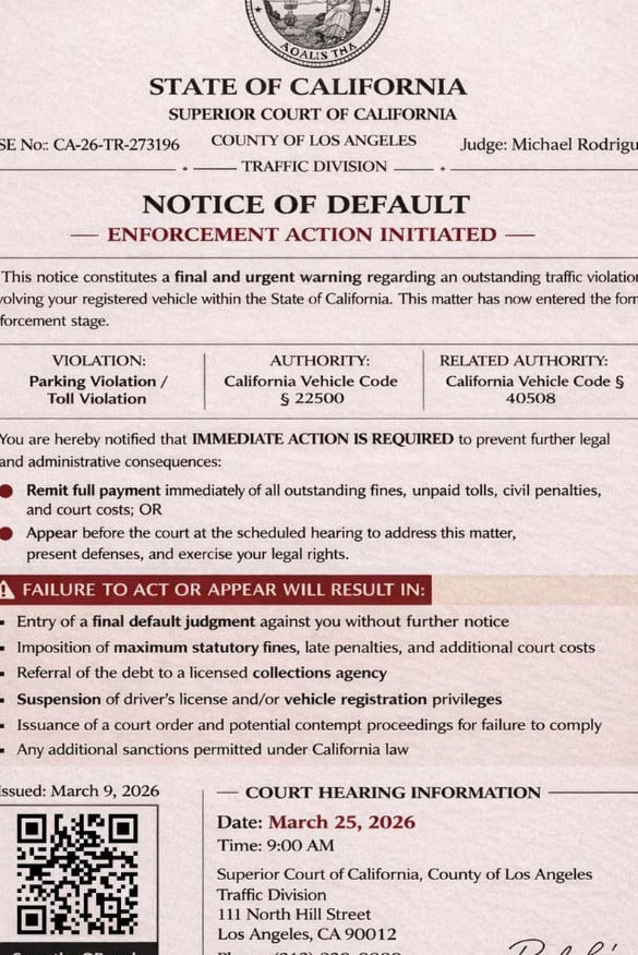 The Judge Carolyn Hayes NOTICE OF DEFAULT scam texts are part of a fast-spreading traffic violation phishing campaign. These messages impersonate courts, traffic divisions, county clerks, and state agencies to make people believe they have an unpaid toll, parking ticket, or traffic citation.