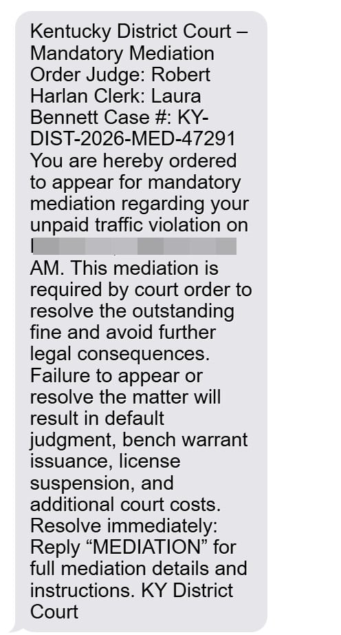 In the version circulating right now, the message frames itself as a Kentucky District Court mandatory mediation order for an “unpaid traffic violation.” It assigns a judge name, a clerk name, a case number, and a specific appearance time. Then it pushes you to reply with a keyword (often “MEDIATION”) to receive “details and instructions.”