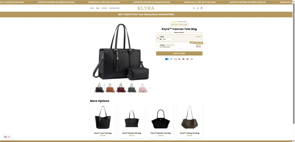 Klyra Bags (tryklyra.com) looks like the kind of “found it at the perfect time” deal that spreads fast on social media. A clean storefront. Big lifestyle photos. A “money back guaranteed” promise. Tote bags priced low enough to feel like a steal, especially when the page pushes bundles, “free gifts,” and limited-time discounts.