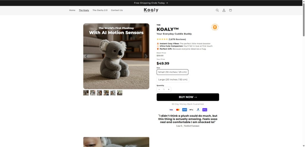 The ads repeatedly claim that KOALY is AI-powered, responsive, and lifelike. In reality, buyers report receiving a basic stuffed toy with no motion sensors or AI capabilities, making the advertisements misleading at best.