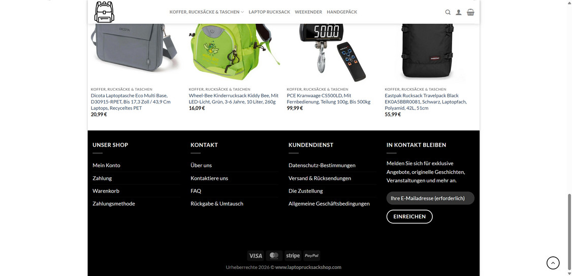 Laptoprucksackshop.com shows multiple red flags consistent with a scam or highly deceptive storefront, including unrealistic discounts, limited support channels (often only an email/contact form), and patterns that match known fake retail operations. The safest assumption is that it is not a trustworthy retailer.