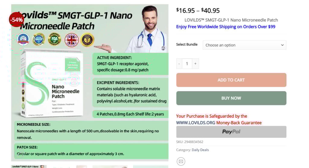 Lovilds™ SMGT-GLP-1 Nano Microneedle Patch is not a clinically tested, doctor-endorsed, or FDA-approved treatment for weight loss or blood sugar regulation. It is a highly deceptive product marketed through:
