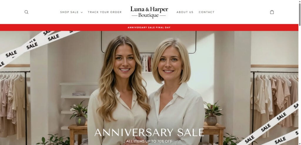 Luna & Harper Boutique fits a common high-risk “sale event” pattern: extreme discounts, urgency banners, a polished template, and claims meant to build trust fast. That does not prove fraud in every case, but it is enough to treat the store as high risk until you can verify it outside the site itself.