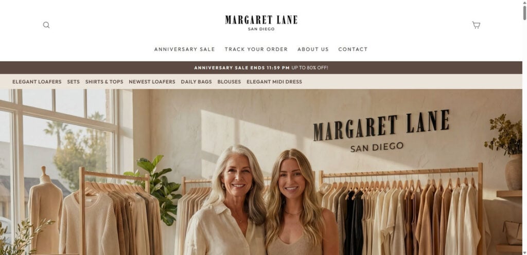 Margaret Lane San Diego matches a common high-risk “sale event” storefront pattern that spreads through social media ads using urgency: closing sales, anniversary sales, event sales, and dramatic discounts like 70% to 90% off.