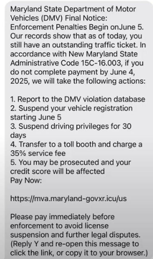“Maryland State Department of Motor Vehicles (DMV) Final Notice: Enforcement Penalties Begin on June 5. Our records show that as of today, you still have an outstanding traffic ticket…”