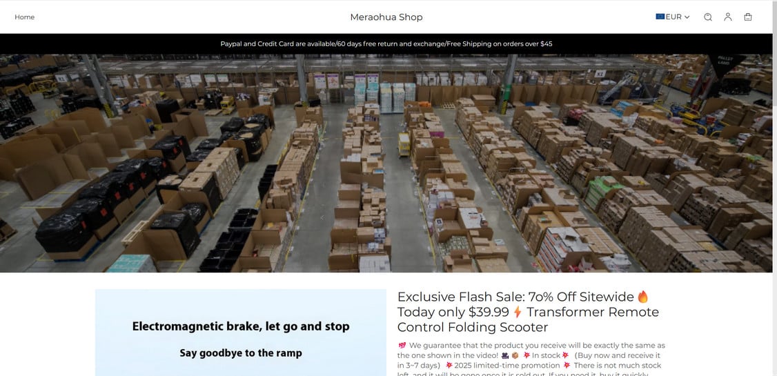 Scammers behind Meraohua.com use spam emails and social media platforms like Facebook, Instagram, and TikTok to promote the site and lure in victims. This fraudulent site uses incredibly low prices and stolen product images to entice unsuspecting shoppers.