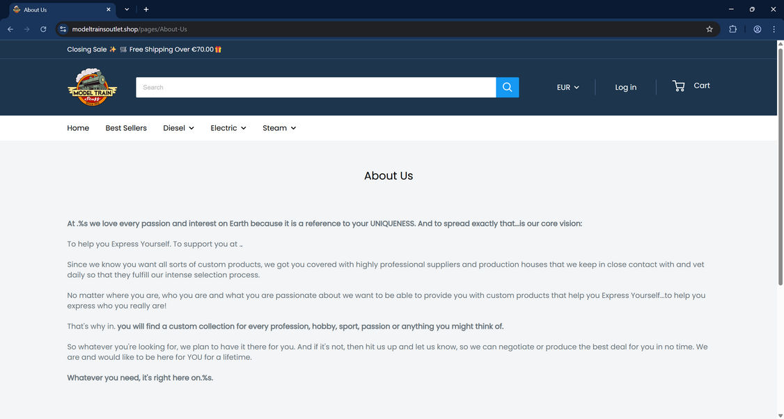 Modeltrainsoutlet.shop displays many suspicious signs that it is a fraudulent website masquerading as a legitimate online retailer. Savvy shoppers should watch for these red flags: