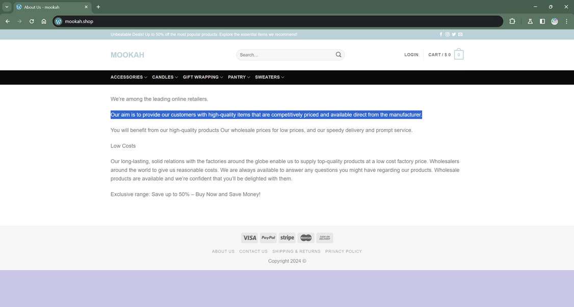 All product info and images are stolen from other major retailers. Mookah.shop lacks any original content showing its illegitimacy.