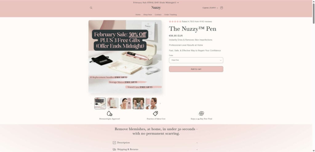 The Nuzzy Pen is marketed as a fast, professional, at-home solution for skin imperfections, backed by big discounts, bold effectiveness claims, and persuasive before-and-after visuals.