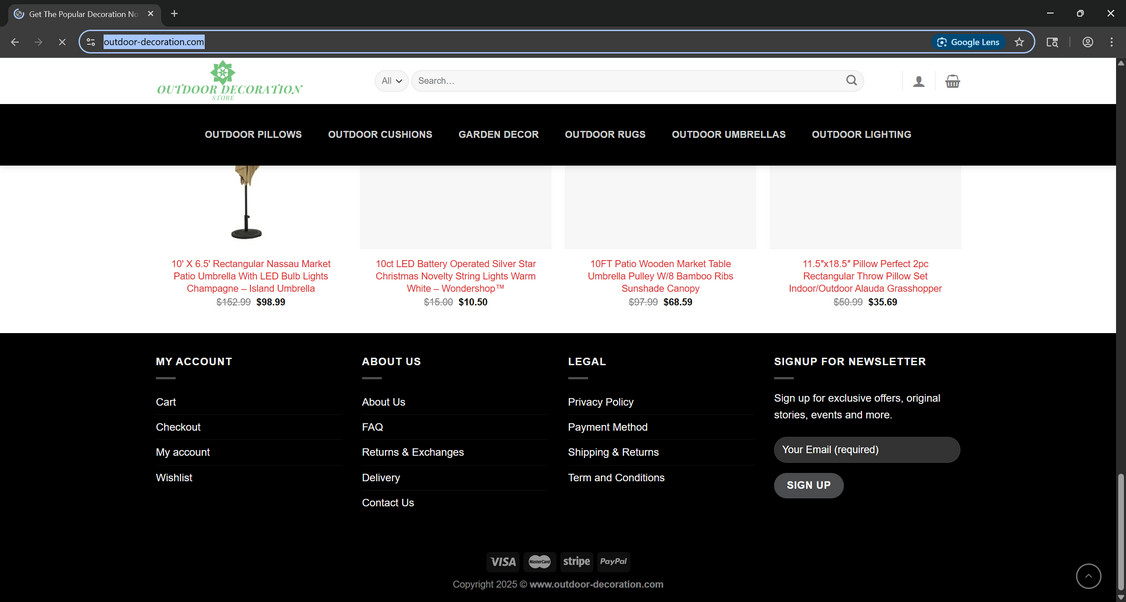 On the surface, Outdoor-decoration.com appears to be a legitimate online retailer selling various discounted items to shoppers at prices significantly lower than major retailers. However, in reality, Outdoor-decoration.com is a scam website that engages in deceptive tactics to trick customers into placing orders and handing over their money or sensitive personal information.