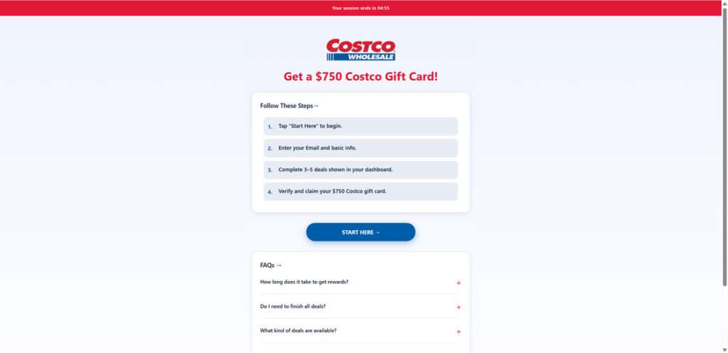 The site preys on users by combining psychological manipulation and familiarity. The use of Costco’s logo builds instant trust, while the promise of easy money triggers curiosity and excitement. People often think, “It’s Costco, so it must be real,” and act quickly without verifying.