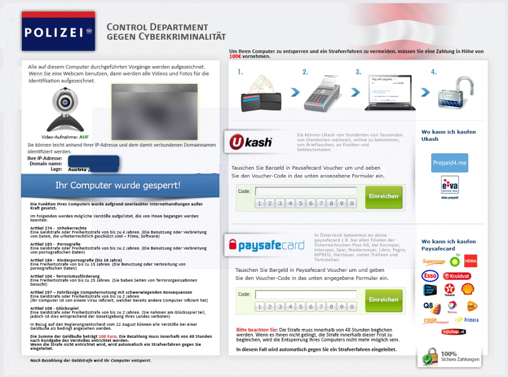 The Polizei Control Department Gegen Cyberkriminalität Ukash Ransomware is a computer virus, which will display a bogus alert, that pretends to be from the Austrian police and states that your computer has been blocked due to it being involved with the distribution of pornographic material, SPAM and copyrighted content.