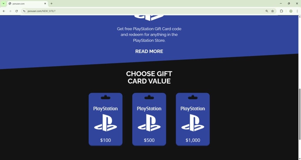 Psnuser.com is not a legitimate PlayStation gift card source. It is a fake PSN gift card generator scam that uses PlayStation branding and giveaway language to lure people into a monetized scam funnel.