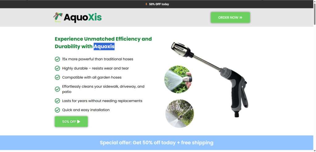 The Aquoxis Pressure Washer is closer to a scam than a legitimate cleaning tool. While it is marketed as a revolutionary “hydro-power” device that can deliver extreme pressure, in reality, it is nothing more than a basic garden hose nozzle rebranded and sold at inflated prices. Identical products can be found on AliExpress or Alibaba for $2–$3, while Aquoxis sells them for $65. Combined with fake reviews, misleading before-and-after photos, and exaggerated claims, it fits the profile of a dropshipping scam operation.