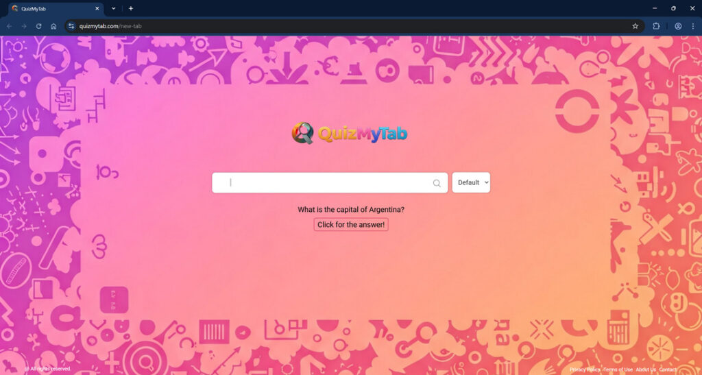 Quizmytab.com is a search engine that is promoted through the use of malicious browser extensions and browser hijackers. When installed, these browser hijackers modify your web browser’s configuration to automatically send all searches through Quizmytab.com.