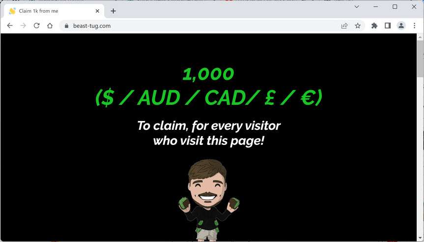 Beast-tug.com is a malicious site that claims to be associated with the popular internet personality and philanthropist MrBeast. The site claims to offer a reward of $1,000 to every visitor who clicks the “CLAIM REWARD” button, but this is a trick to steal personal information or download malware onto the visitor’s device.