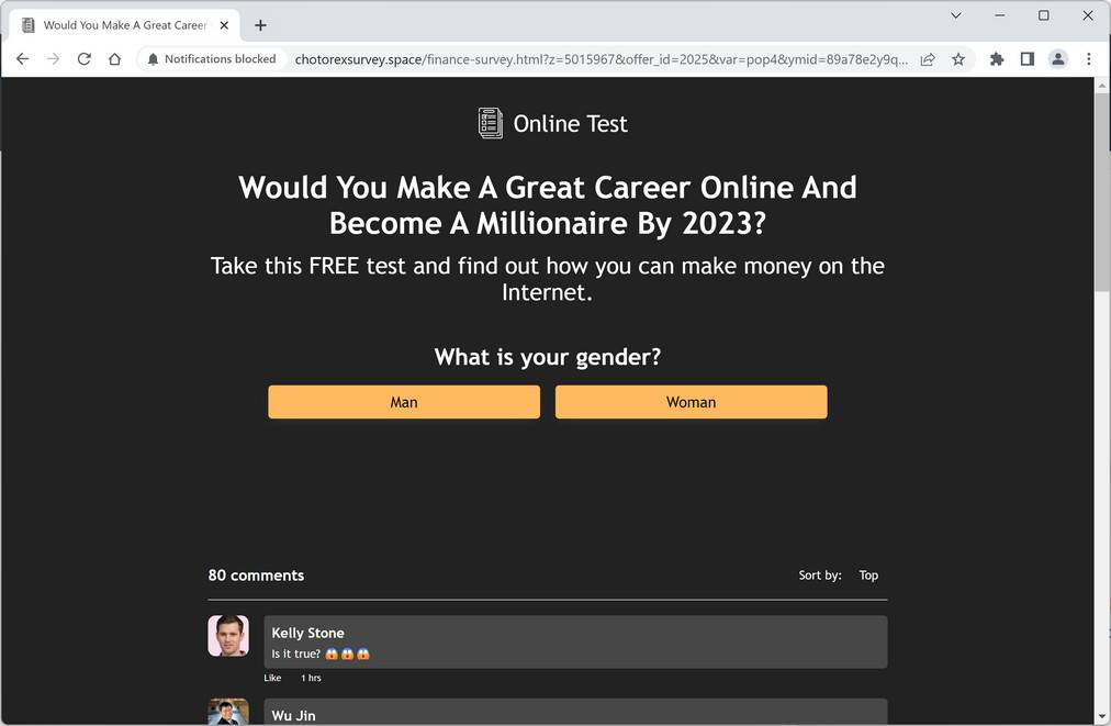 Your browser may be redirected to Chotorexsurvey.space due to malware infection on your device, push notifications from malicious sites, or by being redirected from another website you visited. Less reputable sites may display malicious ads that redirect your browser to Chotorexsurvey.space in order to generate advertising revenue. If this happens, you should close the page and consider installing an ad blocker like AdGuard [recommended] to block these types of ads. If you continue to see pop-ups from Chotorexsurvey.space, it is possible that your computer is infected with a malicious program, and you should scan your device for adware and remove it.