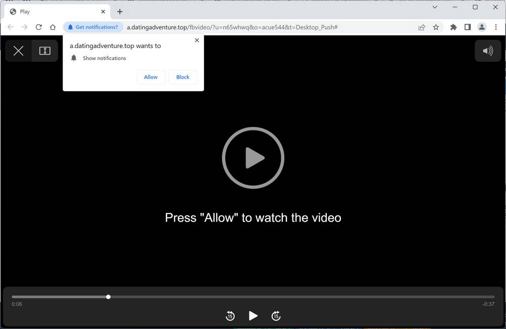 Datingadventure.top is a malicious website that uses the browser’s built-in push notifications system to show spam pop-up ads on victims’ devices.