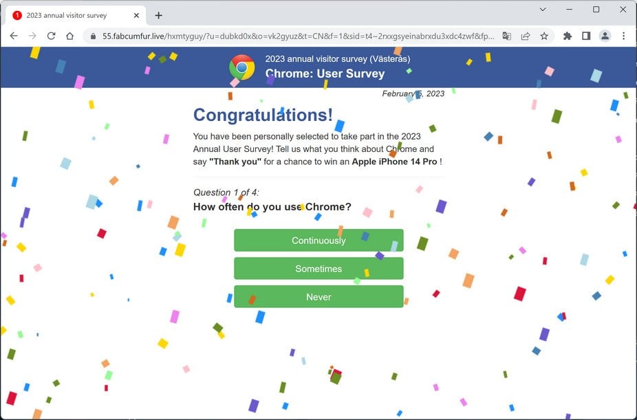 Fabcumfur.live is a site that claims to be from a legitimate company (eg; Amazon, Google, your Internet Service Provider) and then asks you to complete a survey to win a gift card or a tech prize (Samsung Galaxy, MacBook Pro, iPhone). If you complete this survey, in the end, you’ll be either asked to enter personal information such as credit card details, email, home address, or subscribe to unneeded paid services.