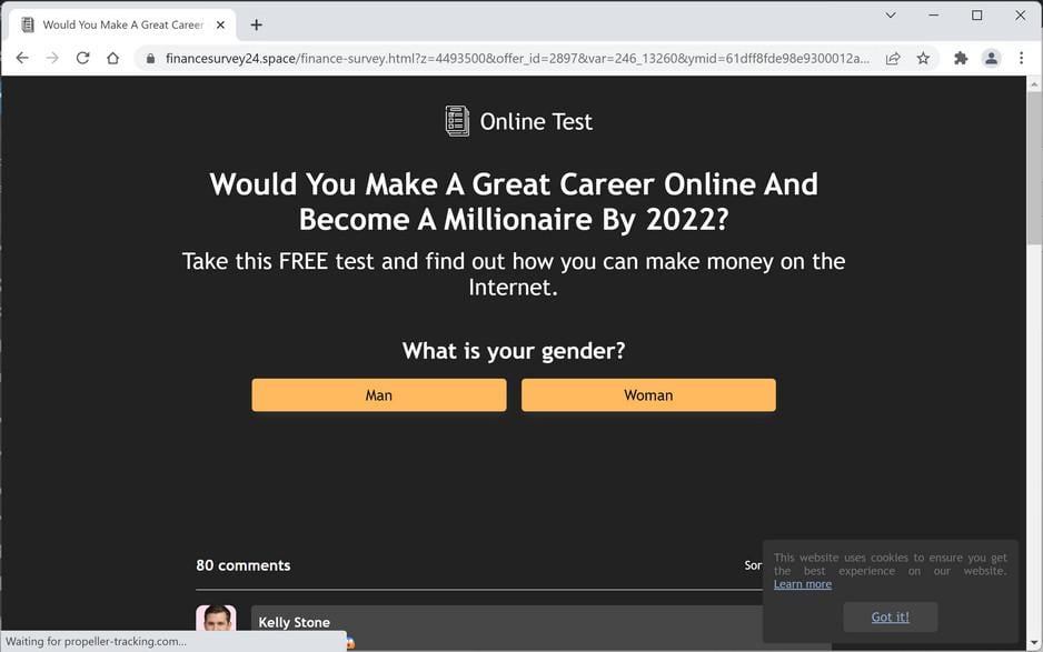 Financesurvey24.space is a site that tries to trick you into subscribing to its push notifications so that it can send notification spam directly to your desktop or phone.
