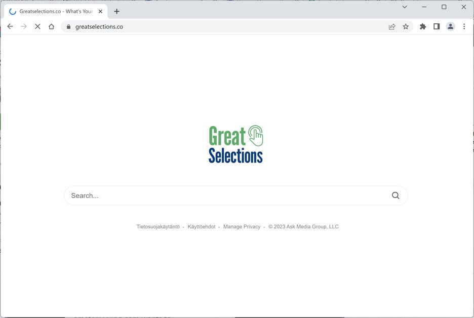 Greatselections.co is a search engine that is promoted through the use of malicious browser extensions and browser hijackers. When installed, these browser hijackers modify your web browser’s configuration to automatically send all searches through Greatselections.co.